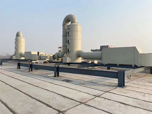 4、喷淋塔+活性炭吸附装置,即主风管到楼顶后先连接喷淋塔后再经过活性炭吸附装置,净化后的尾气气排出去。
